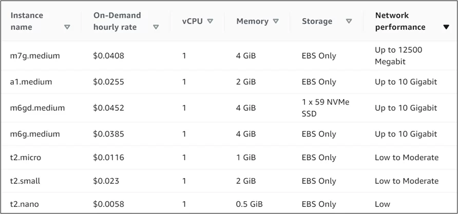 - r6g.large, r6g.xlarge, r6g.2xlarge: Instances powered by AWS Graviton2 processors, with a balance of memory and price-performance.