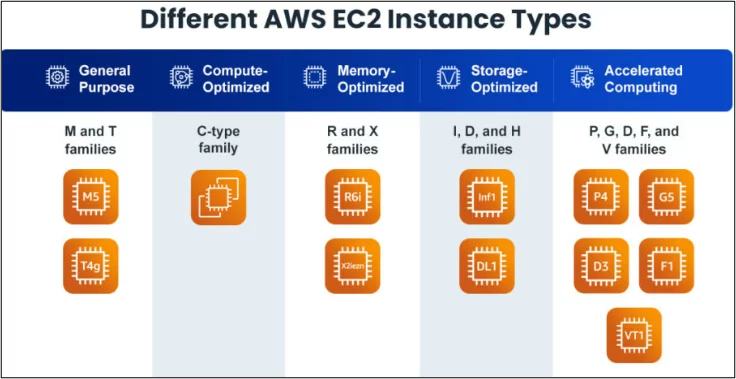 AWS EC2 (Elastic Compute Cloud) offers a variety of instance kinds, each designed to meet the needs of different workloads. Here are some examples of EC2 instance types that are commonly used: