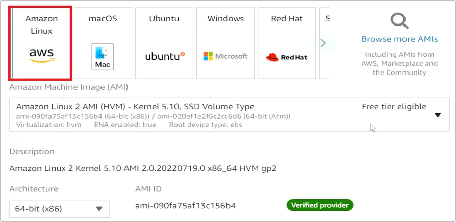 - Select Operating System (OS) i.e., Amazon Linux