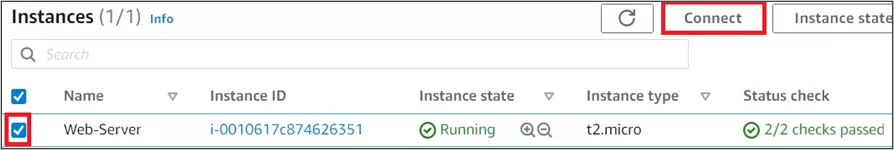 - On your Instances page, tick the box of web server, and click on Connect